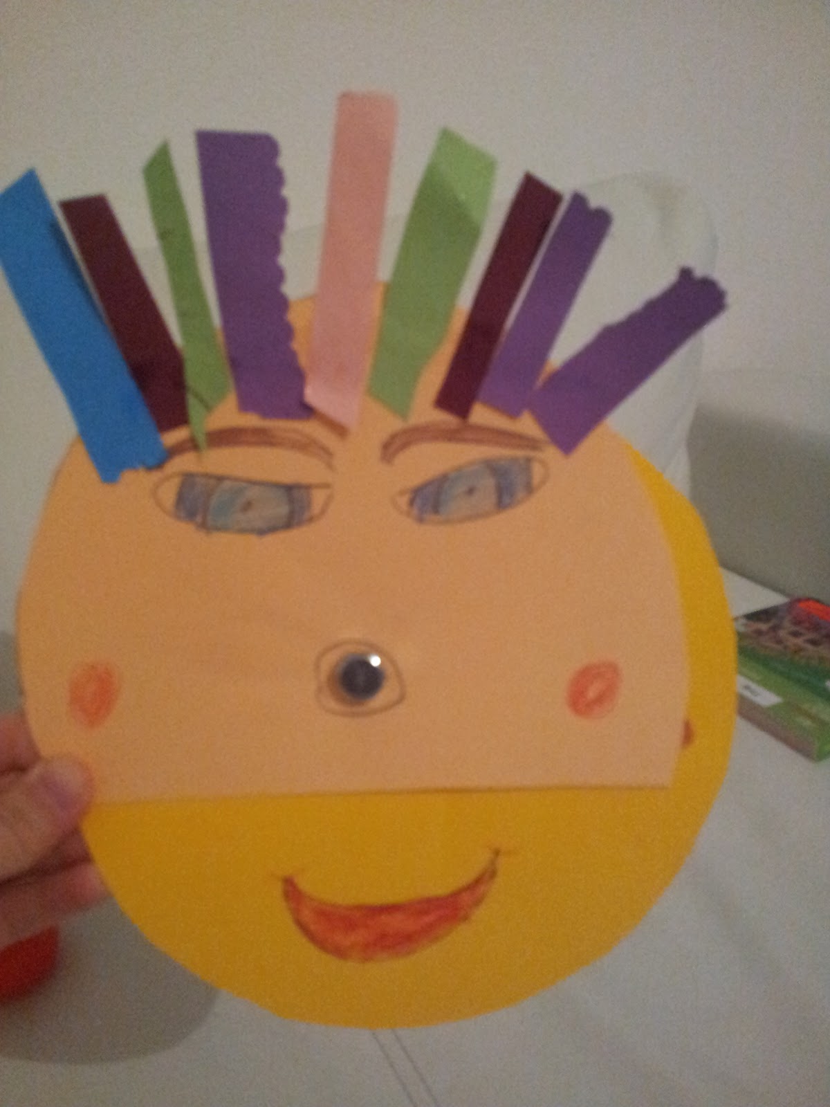 gelelım Duygu Barometremıze: daıre seklınde bır kalın karton 4 yuz ıfadesını, yarım daıre seklıne de yuzu cızdım resımdekı gıbı ortaya ucu kalın olmayan ve arakdan dusmesını engellemesı ıcın bır vıda kapagı taktım. sonra kısa kısa kagıtları kesıp yarım daıre olan yuzun ustunden yapıstırdım ne kadar cok karton konulursa o kadar cok sacı olucak yanı o kadar ıyı olucak demektır. yalnız ben boyle dıkıs nakıs el ıslerıne zaten yatkın degılım hele de 2 cocuk oldugundan ıncesıne dıkkat edıp estetık bır yuz cızemedım emınım sız daha guzelını yaparsınız ;)